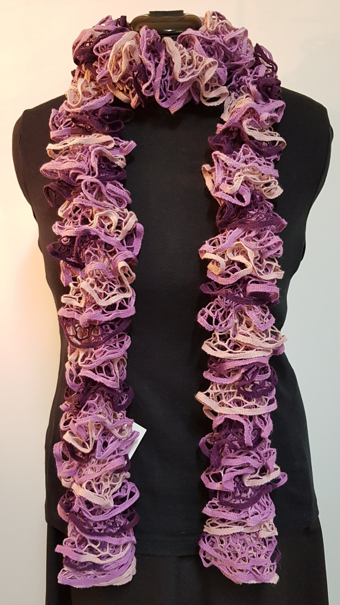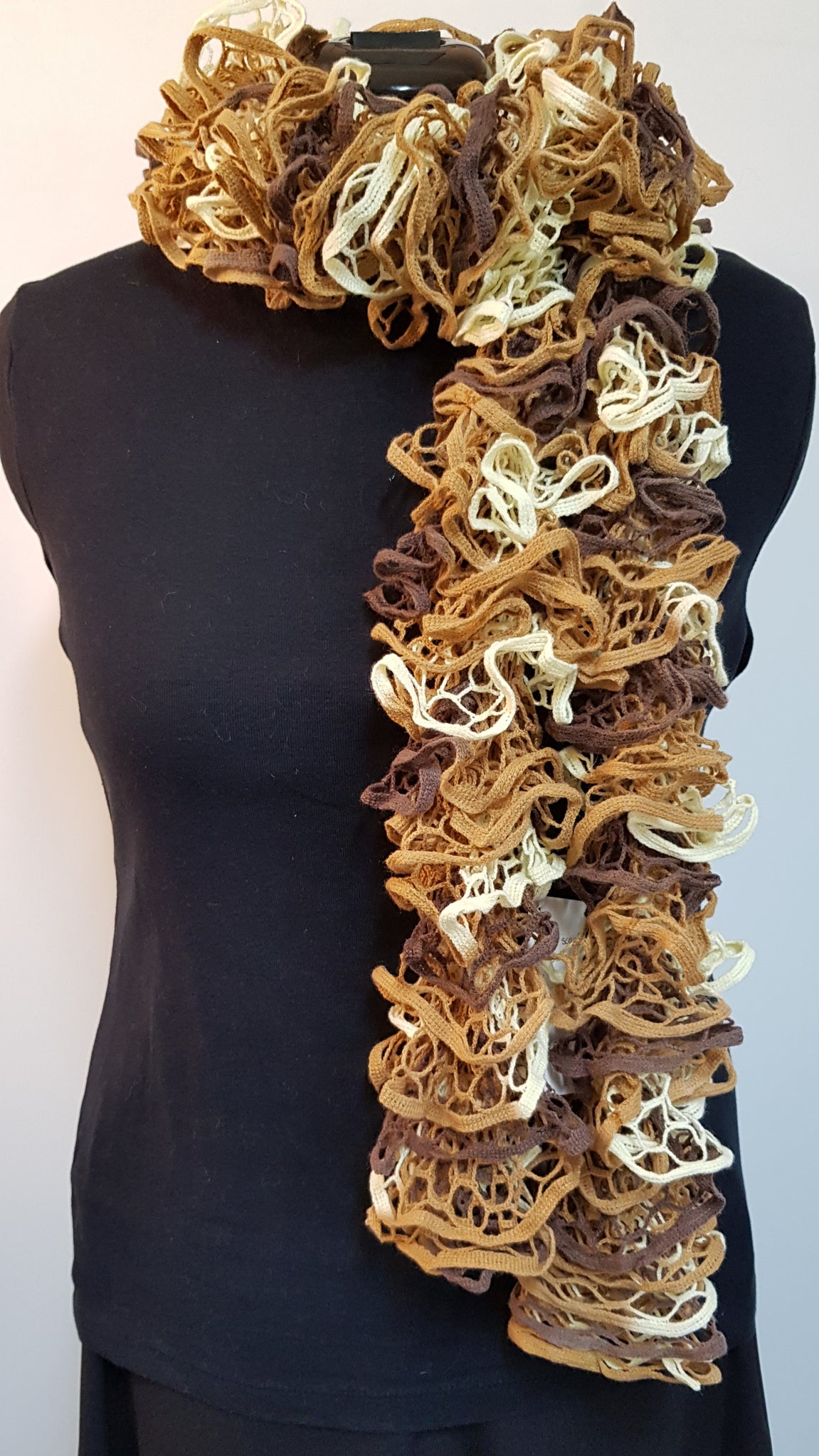Variegated colours and shades, these lovely ruffled scarves make a statement, and keep you warm at the same time. 100% acrylic. 200cm long and approximately 9cm wide.